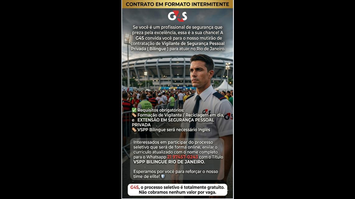 A G4S, o processo seletivo é totalmente gratuito. Não cobramos nenhum valor por vaga.